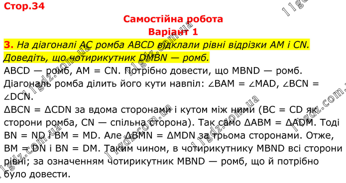 Самостійна робота Варіант 1 3. На діагоналі AC ромба ABCD відклали рівні відрізки AM і CN. Доведіть, що чотирикутник DMBN — ромб. ABCD — ромб, AM = CN. Потрібно довести, що MBND — ромб. Діагональ ромба ділить його кути навпіл: ∠BAM = ∠MAD, ∠BCN = ∠DCN. ∆BCN = ∆CDN за вдома сторонами і кутом між ними (BC = CD як сторони ромба, CN — спільна сторона). Так само ∆ABM = ∆ADM. Тоді BN = ND i BM = MD. Але ∆BMN = ∆MDN за трьома сторонами. Отже, BM = DN і BN = DM. Таким чином, в чотирикутнику MBND всі сторони рівні; за означенням чотирикутник MBND — ромб, що й потрібно було довести.