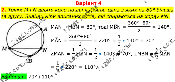 Варіант 4 2. Точки M і N ділять коло на дві частини, одна з яких на 80° більша за другу. Знайди міри вписаних кутів, які спираються на хорду MN. MA ̅N – MB ̅N = 80°, тоді MB ̅N = (360°-80°)/2 = 140°, MA ̅N = (360°+80°)/2 = 220° = 1/2 • 140° = 70° ∠MAN = 1/2 MB ̅N = 1/2 • 140° = 70°, ∠MBN = 1/2 MA ̅N = 1/2 • 220° = 110°. Відповідь: 70° і 110°.