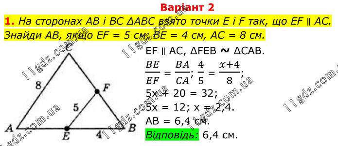 Варіант 2 1. На сторонах AB і BC ∆ABC взято точки E і F так, що EF ∥ AC. Знайди AB, якщо EF = 5 см, BE = 4 см, AC = 8 см. EF ∥ AC, ∆FEB ~ ∆CAB. BE/EF = BA/CA; 4/5 = (x+4)/8; 5х + 20 = 32; 5х = 12; х = 2,4. AB = 6,4 см. Відповідь: 6,4 см.