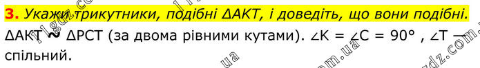 3. Укажи трикутники, подібні ∆AKT, і доведіть, що вони подібні. ∆АКТ ~ ∆PCT (за двома рівними кутами). ∠K = ∠C = 90° , ∠T — спільний.