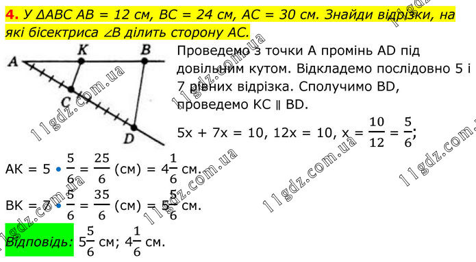 4. У ∆ABC AB = 12 см, BC = 24 см, AC = 30 см. Знайди відрізки, на які бісектриса ∠B ділить сторону AC. Проведемо з точки А промінь AD під довільним кутом. Відкладемо послідовно 5 і 7 рівних відрізка. Сполучимо BD, проведемо KC ∥ BD. 5х + 7х = 10, 12х = 10, х = 10/12 = 5/6; АК = 5 • 5/6 = 25/6 (см) = 41/6 см. BK = 7 • 5/6 = 35/6 (см) = 55/6 см. Відповідь: 55/6 см; 41/6 см.