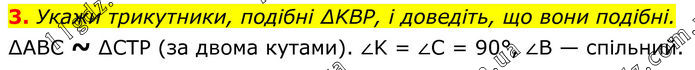 3. Укажи трикутники, подібні ∆KBP, і доведіть, що вони подібні. ∆АВС ~ ∆CTP (за двома кутами). ∠K = ∠C = 90°, ∠B — спільний.