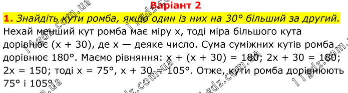 Варіант 2 1. Знайдіть кути ромба, якщо один із них на 30° більший за другий. Нехай менший кут ромба має міру х, тоді міра більшого кута дорівнює (х + 30), де х — деяке число. Сума суміжних кутів ромба дорівнює 180°. Маємо рівняння: х + (х + 30) = 180; 2х + 30 = 180; 2х = 150; тоді х = 75°, х + 30 = 105°. Отже, кути ромба дорівнюють 75° і 105°.
