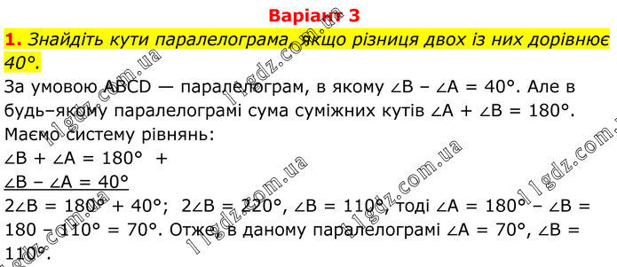 Варіант 3 1. Знайдіть кути паралелограма, якщо різниця двох із них дорівнює 40°. За умовою ABCD — паралелограм, в якому ∠B – ∠A = 40°. Але в будь–якому паралелограмі сума суміжних кутів ∠A + ∠B = 180°. Маємо систему рівнянь: ∠B + ∠A = 180° + ∠B – ∠A = 40° 2∠B = 180° + 40°; 2∠B = 220°, ∠B = 110°, тоді ∠A = 180° – ∠B = 180 – 110° = 70°. Отже, в даному паралелограмі ∠A = 70°, ∠B = 110°.