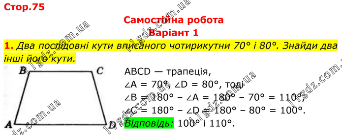 Самостійна робота Варіант 1 1. Два послідовні кути вписаного чотирикутни 70° і 80°. Знайди два інші його кути. ABCD — трапеція, ∠A = 70°, ∠D = 80°, тоді ∠B = 180° – ∠A = 180° – 70° = 110°, ∠C = 180° – ∠D = 180° – 80° = 100°. Відповідь: 100° і 110°.