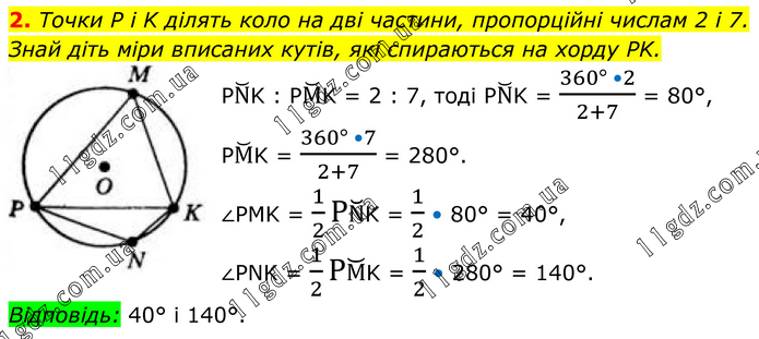 2. Точки P і K ділять коло на дві частини, пропорційні числам 2 і 7. Знай діть міри вписаних кутів, які спираються на хорду PK. PN ̆K : PM ̆K = 2 : 7, тоді PN ̆K = (360° •2)/(2+7) = 80°, PM ̆K = (360° •7)/(2+7) = 280°. ∠PMK = 1/2 PN ̆K = 1/2 • 80° = 40°, ∠PNK = 1/2 РM ̆K = 1/2 • 280° = 140°. Відповідь: 40° і 140°.