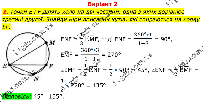 Варіант 2 2. Точки E і F ділять коло на дві частини, одна з яких дорівнює третині другої. Знайди міри вписаних кутів, які спираються на хорду EF. EN ̅F = 1/3 EM ̅F, тоді EN ̅F = (360°•1)/(1+3) = 90°, EM ̅F = (360°•3)/(1+3) = 270°. ∠EMF = 1/2 EN ̅F = 1/2 • 90° = 45°, ∠ENF = 1/2 EM ̅F = 1/2 • 270° = 135°. Відповідь: 45° і 135°.