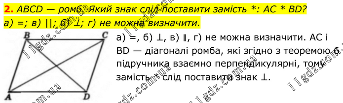 2. ABCD — ромб. Який знак слід поставити замість *: AC * BD? а) =; в) ||; б) ⊥; г) не можна визначити. а) =, б) ⊥, в) ∥, г) не можна визначити. AC і BD — діагоналі ромба, які згідно з теоремою 6 підручника взаємно перпендикулярні, тому замість * слід поставити знак ⊥.