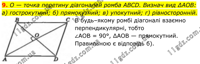 9. O — точка перетину діагоналей ромба ABCD. Визнач вид ∆АОВ: а) гострокутний; б) прямокутний; в) упокутний; г) рівносторонній. В будь–якому ромбі діагоналі взаємно перпендикулярні, тобто ∠AOB = 90°, ∆АОВ — прямокутний. Правильною є відповідь б).