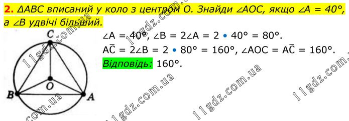 2. ∆ABC вписаний у коло з центром O. Знайди ∠AOC, якщо ∠A = 40°, а ∠B удвічі більший. ∠A = 40°, ∠B = 2∠A = 2 • 40° = 80°. AС ̅ = 2∠B = 2 • 80° = 160°, ∠AOC = AС ̅ = 160°. Відповідь: 160°.