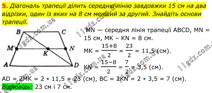 5. Діагональ трапеції ділить середню лінію завдовжки 15 см на два відрізки, один із яких на 8 см менший за другий. Знайдіть основи трапеції. MN — середня лінія трапеції ABCD, MN = 15 см, MK – KN = 8 см. МK = (15+8)/2 = 23/2 = 11,5 (см). KN = (15-8)/2 = 7/2 = 3,5 (см). AD = 2МК = 2 • 11,5 = 23 (см), BC = 2KN = 2 • 3,5 = 7 (см). Відповідь: 23 см і 7 см.