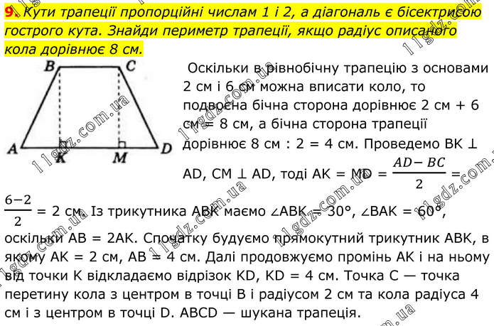 9. Кути трапеції пропорційні числам 1 і 2, а діагональ є бісектрисою гострого кута. Знайди периметр трапеції, якщо радіус описаного кола дорівнює 8 см. Оскільки в рівнобічну трапецію з основами 2 см і 6 см можна вписати коло, то подвоєна бічна сторона дорівнює 2 см + 6 см = 8 см, а бічна сторона трапеції дорівнює 8 см : 2 = 4 см. Проведемо BK ⊥ AD, CM ⊥ AD, тоді AK = MD = (AD- BC)/2 = (6-2)/2 = 2 см. Із трикутника ABK маємо ∠ABK = 30°, ∠BAK = 60°, оскільки AB = 2AK. Спочатку будуємо прямокутний трикутник ABK, в якому AK = 2 см, AB = 4 см. Далі продовжуємо промінь AK і на ньому від точки K відкладаємо відрізок KD, KD = 4 см. Точка C — точка перетину кола з центром в точці В і радіусом 2 см та кола радіуса 4 см і з центром в точці D. ABCD — шукана трапеція.
