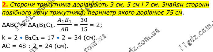 2. Сторони трикутника дорівнюють 3 см, 5 см і 7 см. Знайди сторони подібного йому трикутника, периметр якого дорівнює 75 см. ∆ABC ~ ∆A1B1C1. (A_1 B_1)/AB = 30/15 = 2; k = 2 • B1C1 = 17 • 2 = 34 (см). AC = 48 : 2 = 24 (см).