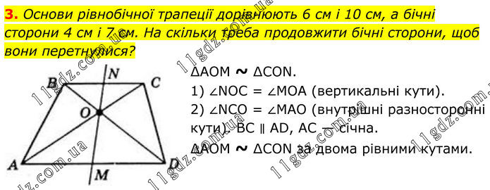 3. Основи рівнобічної трапеції дорівнюють 6 см і 10 см, а бічні сторони 4 см і 7 см. На скільки треба продовжити бічні сторони, щоб вони перетнулися? ∆AOM ~ ∆CON. 1) ∠NOC = ∠MOA (вертикальні кути). 2) ∠NCO = ∠MAO (внутрішні разносторонні кути). BC ∥ AD, AC — січна. ∆AOM ~ ∆CON за двома рівними кутами.