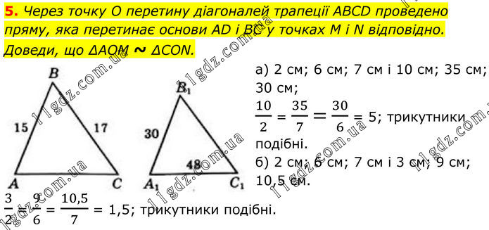 5. Через точку O перетину діагоналей трапеції ABCD проведено пряму, яка перетинає основи AD і BC у точках M i N відповідно. Доведи, що ∆AOM ~ ∆CON. а) 2 см; 6 см; 7 см і 10 см; 35 см; 30 см; 10/2 = 35/7 = 30/6 = 5; трикутники подібні. б) 2 см; 6 см; 7 см і 3 см; 9 см; 10,5 см. 3/2 = 9/6 = 10,5/7 = 1,5; трикутники подібні.