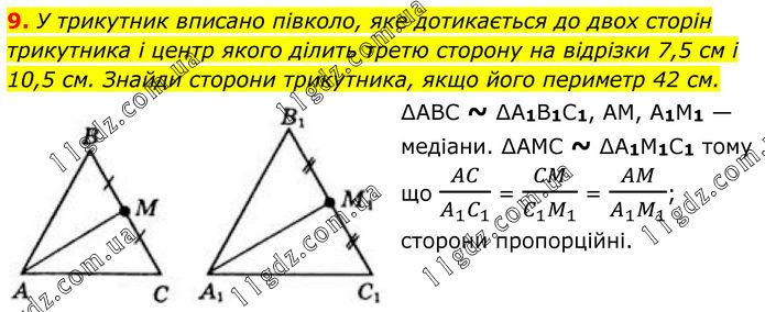 9. У трикутник вписано півколо, яке дотикається до двох сторін трикутника і центр якого ділить третю сторону на відрізки 7,5 см і 10,5 см. Знайди сторони трикутника, якщо його периметр 42 см. ∆ABC ~ ∆A1B1C1, AM, A1M1 — медіани. ∆AMC ~ ∆A1M1C1 тому що AC/(A_1 C_1 ) = CM/(C_1 M_1 ) = AM/(A_1 M_1 ); сторони пропорційні.