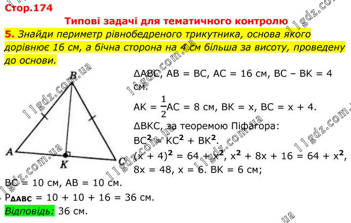 Типові задачі для тематичного контролю 5. Знайди периметр рівнобедреного трикутника, основа якого дорівнює 16 см, а бічна сторона на 4 см більша за висоту, проведену до основи. ∆АВС, AB = BC, AC = 16 см, BC – BK = 4 см. AK = 1/2АС = 8 см, ВК = х, BC = х + 4. ∆BKC, за теоремою Піфагора: BC2 = KC2 + BK2. (х + 4)2 = 64 + x2, x2 + 8х + 16 = 64 + x2, 8х = 48, х = 6. BK = 6 см; BC = 10 см, AB = 10 см. P∆ABC = 10 + 10 + 16 = 36 см. Відповідь: 36 см.