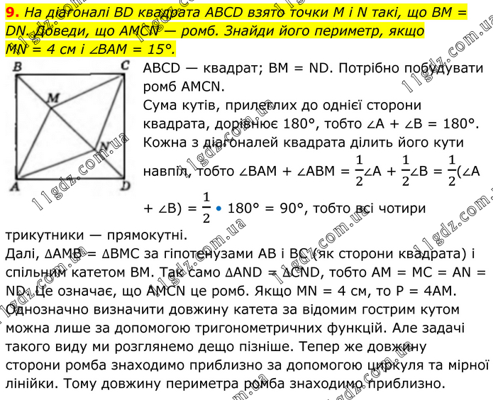 9. На діагоналі BD квадрата ABCD взято точки M і N такі, що BM = DN. Доведи, що AMCN — ромб. Знайди його периметр, якщо MN = 4 см і ∠BAM = 15°. ABCD — квадрат; BM = ND. Потрібно побудувати ромб AMCN. Сума кутів, прилеглих до однієї сторони квадрата, дорівнює 180°, тобто ∠A + ∠B = 180°. Кожна з діагоналей квадрата ділить його кути навпіл, тобто ∠BAM + ∠ABM = 1/2∠A + 1/2∠B = 1/2(∠A + ∠B) = 1/2 • 180° = 90°, тобто всі чотири трикутники — прямокутні. Далі, ∆AMB = ∆BMC за гіпотенузами AB і BC (як сторони квадрата) і спільним катетом BM. Так само ∆AND = ∆CND, тобто AM = MC = AN = ND. Це означає, що AMCN це ромб. Якщо MN = 4 см, то P = 4AM. Однозначно визначити довжину катета за відомим гострим кутом можна лише за допомогою тригонометричних функцій. Але задачі такого виду ми розглянемо дещо пізніше. Тепер же довжину сторони ромба знаходимо приблизно за допомогою циркуля та мірної лінійки. Тому довжину периметра ромба знаходимо приблизно.