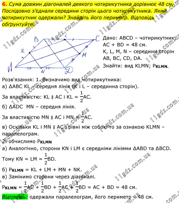 6. Сума довжин діагоналей деякого чотирикутника дорівнює 48 см. Послідовно з’єднали середини сторін цього чотирикутника. Який чотирикутник одержали? Знайдіть його периметр. Відповідь обґрунтуйте. Дано: ABCD – чотирикутник; АС + BD = 48 см. K, L, M, N – середини сторін AB, BC, CD, DA. Знайти: вид KLMN; PKLMN. Розв'язання: 1. Визначимо вид чотирикутника: a) ∆АВС KL – середня лінія (K і L – серединна сторін). За властивістю: KL ∥ AC і KL = 1/2AC. б) ∆ADC MN – середня лінія. За властивістю MN ∥ AC і MN = 1/2AC. в) Оскільки KL і MN ∥ AC і рівні між собою то за ознакою KLMN – паралелограм. 2. обчислимо РKLMN. a) Аналогічно, сторони KN і LM є середніми лініями ∆ABD та ∆BCD. Тому KN = LM = 1/2BD. б) РKLMN = KL + LM + MN + NK. в) Замінимо сторони через діагоналі. РKLMN = 1/2AC + 1/2BD + 1/2AC + 1/2BD = AC + BD = 48 см. Відповідь: одержали паралелограм, його периметр – 48 см.