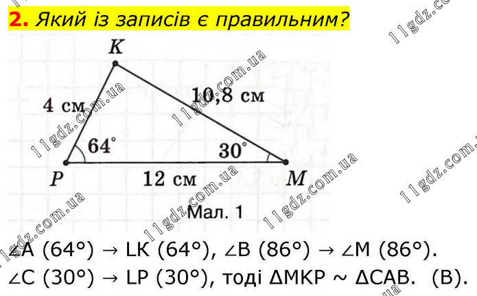 2. Який із записів є правильним? ∠А (64°) → LК (64°), ∠B (86°) → ∠М (86°). ∠C (30°) → LP (30°), тоді ∆MKP ~ ∆CAB. (В).