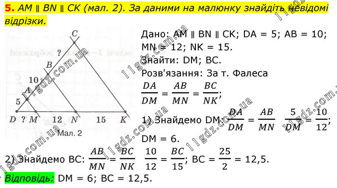 5. AM ∥ BN ∥ CK (мал. 2). За даними на малюнку знайдіть невідомі відрізки. Дано: AM ∥ BN ∥ CK; DA = 5; AB = 10; MN = 12; NK = 15. Знайти: DM; BC. Розв'язання: За т. Фалеса DA/DM = AB/MN = BC/NK; 1) Знайдемо DM: DA/DM = AB/MN 5/DM = 10/12; DM = 6. 2) Знайдемо BC: AB/MN = BC/NK 10/12 = BC/15; BC = 25/2 = 12,5. Відповідь: DM = 6; BC = 12,5.