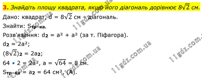 3. Знайдіть площу квадрата, якщо його діагональ дорівнює 8√2 см. Дано: квадрат, d = 8√2 см – діагональ. Знайти: Sтр–ка. Розв'язання: d2 = а² + а² (за т. Піфагора). d2 = 2a²; (8√2)2 = 2а2; 64 • 2 = 2a², a = √64 = 8 см. Sтр–ка = a2 = 64 см², (A).