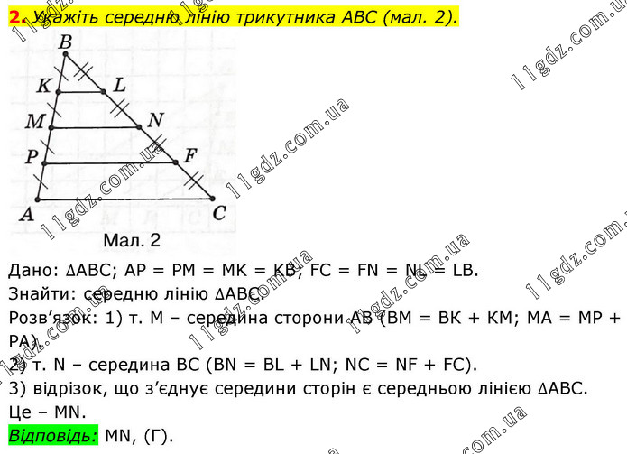 2. Укажіть середню лінію трикутника ABC (мал. 2). Дано: ∆АВС; АР = PM = MK = KB; FC = FN = NL = LB. Знайти: середню лінію ∆АВС. Розв’язок: 1) т. М – середина сторони АВ (ВМ = ВК + КМ; МА = МР + РА). 2) т. N – середина ВС (BN = BL + LN; NC = NF + FC). 3) відрізок, що з’єднує середини сторін є середньою лінією ∆АВС. Це – MN. Відповідь: MN, (Г).