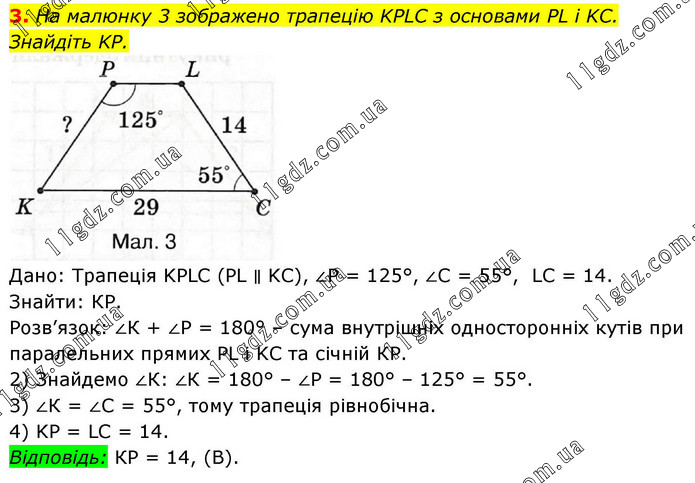 3. На малюнку 3 зображено трапецію KPLC з основами PL і KC. Знайдіть KP. Дано: Трапеція KPLC (PL ∥ KC), ∠P = 125°, ∠C = 55°, LC = 14. Знайти: КР. Розв’язок: ∠К + ∠Р = 180° – сума внутрішніх односторонніх кутів при паралельних прямих PL i KC та січній КР. 2) Знайдемо ∠К: ∠К = 180° – ∠Р = 180° – 125° = 55°. 3) ∠К = ∠С = 55°, тому трапеція рівнобічна. 4) KP = LC = 14. Відповідь: КР = 14, (В).