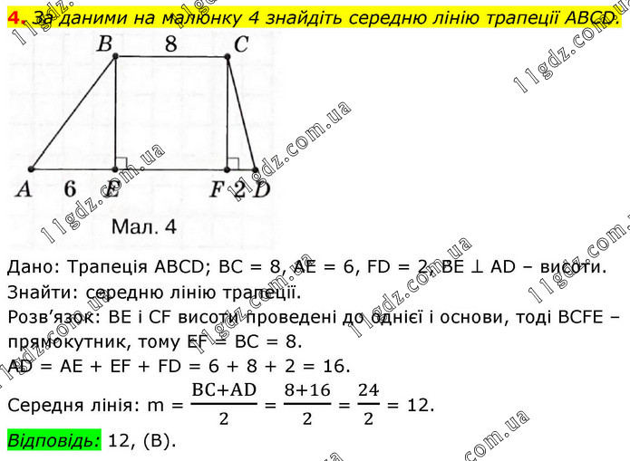 4. За даними на малюнку 4 знайдіть середню лінію трапеції ABCD. Дано: Трапеція ABCD; BC = 8, AE = 6, FD = 2, BE ⊥ AD – висоти. Знайти: середню лінію трапеції. Розв’язок: ВЕ і CF висоти проведені до однієї і основи, тоді BCFE – прямокутник, тому EF = BC = 8. AD = AE + EF + FD = 6 + 8 + 2 = 16. Середня лінія: m = (BC+AD)/2 = (8+16)/2 = 24/2 = 12. Відповідь: 12, (В).
