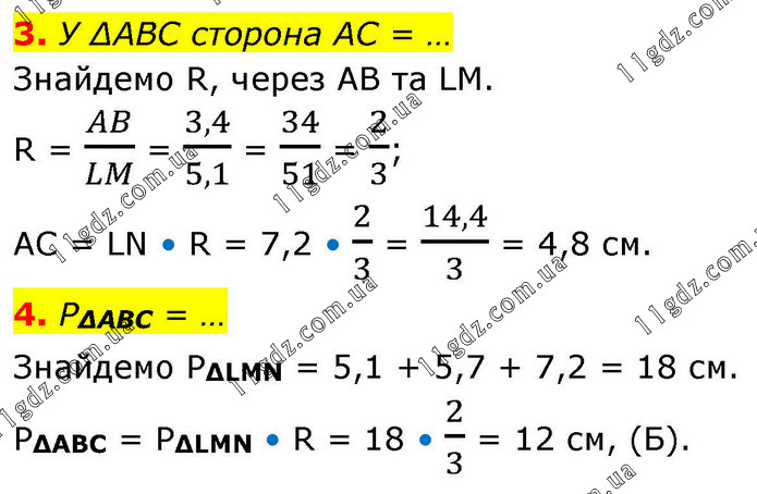 3. У ∆ABC сторона AC = … Знайдемо R, через AB та LM. R = AB/LM = 3,4/5,1 = 34/51 = 2/3; AC = LN • R = 7,2 • 2/3 = 14,4/3 = 4,8 см. 4. Р∆АВС = … Знайдемо P∆LMN = 5,1 + 5,7 + 7,2 = 18 см. P∆ABC = P∆LMN • R = 18 • 2/3 = 12 см, (Б).