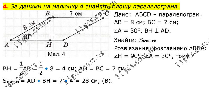 4. За даними на малюнку 4 знайдіть площу паралелограма. Дано: ABCD – паралелограм; АВ = 8 см; ВС = 7 см; ∠А = 30°, ВН ⊥ AD. Знайти: Sкв–та. Розв’язання: розглянемо ∆ВНА: ∠Н = 90°; ∠А = 30°, тому ВН = 1/2АВ = 1/2 • 8 = 4 см; AD = BC = 7 см. Sпа–м = AD • BH = 7 • 4 = 28 см, (В).