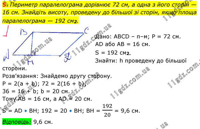 5. Периметр паралелограма дорівнює 72 см, а одна з його сторін — 16 см. Знайдіть висоту, проведену до більшої зі сторін, якщо площа паралелограма — 192 см2. Дано: ABCD – п–м; Р = 72 см. AD або АВ = 16 см. S = 192 см2. Знайти: h проведену до більшої сторони. Розв’язання: Знайдемо другу сторону. P = 2(a + b); 72 = 2(16 + b); 36 = 16 + b; b = 20 см. Тому АВ = 16 см, а AD = 20 см. S = AD • BH; 192 = 20 • BH; BH = 192/20 = 9,6 см. Відповідь: 9,6 см.