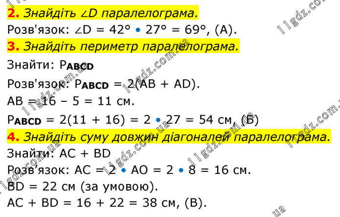 2. Знайдіть ∠D паралелограма. Розв'язок: ∠D = 42° • 27° = 69°, (А). 3. Знайдіть периметр паралелограма. Знайти: PABCD Розв'язок: РABCD = 2(AB + AD). АВ = 16 – 5 = 11 см. PABCD = 2(11 + 16) = 2 • 27 = 54 см, (Б) 4. Знайдіть суму довжин діагоналей паралелограма. Знайти: AC + BD. Розв’язок: AC = 2 • AO = 2 • 8 = 16 см. BD = 22 см (за умовою). AC + BD = 16 + 22 = 38 см, (В).