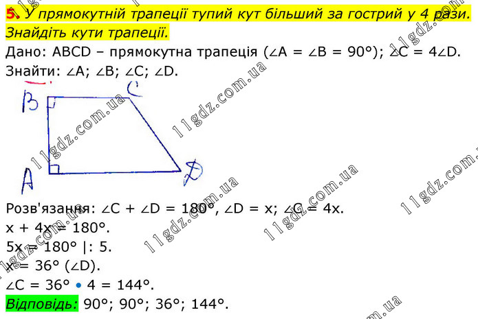 5. У прямокутній трапеції тупий кут більший за гострий у 4 рази. Знайдіть кути трапеції. Дано: ABCD – прямокутна трапеція (∠А = ∠B = 90°); ∠C = 4∠D. Знайти: ∠A; ∠B; ∠C; ∠D. Розв'язання: ∠C + ∠D = 180°, ∠D = x; ∠C = 4x. x + 4x = 180°. 5x = 180° |: 5. x = 36° (∠D). ∠С = 36° • 4 = 144°. Відповідь: 90°; 90°; 36°; 144°.