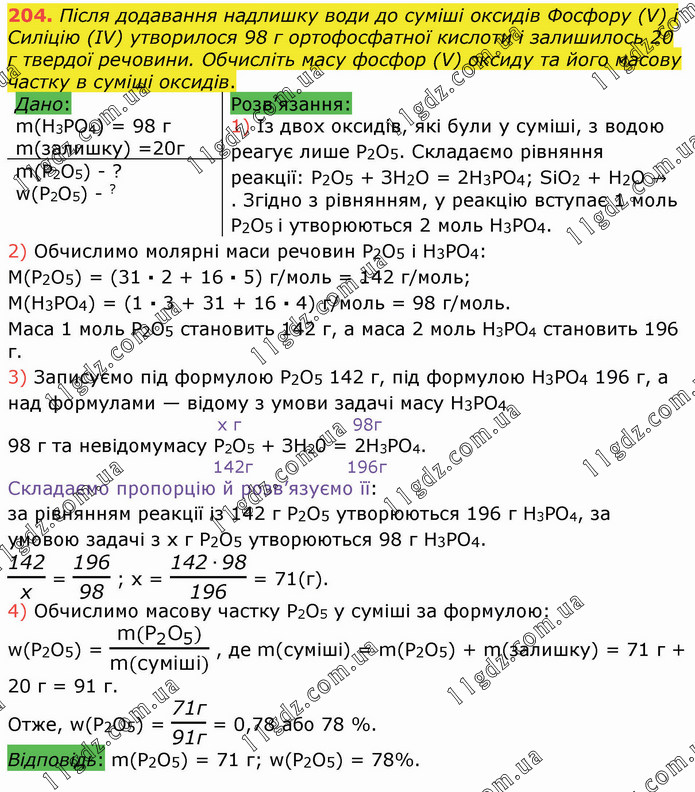 Після додавання надлишку води до суміші оксидів Фосфору (V) і Силіцію (ІV) утворилося 98 г ортофосфатної кислоти і залишилось 20 г твердої речовини. Обчисліть масу фосфор (V) оксиду та його масову частку в суміші оксидів.