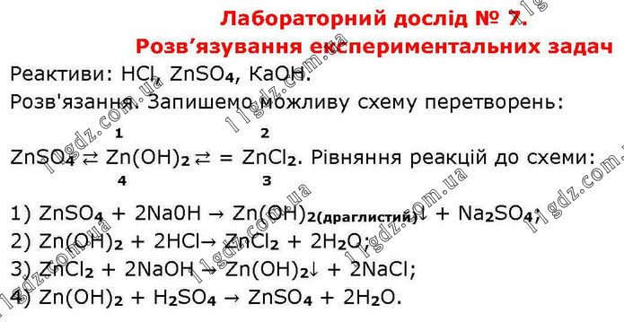 Лабораторний дослід № 7. Розв’язування експериментальних задач Реактиви: НСl, ZnSO4, КаОН. Розв'язання. Запишемо можливу схему перетворень: 1 2 ZnSО4 ⇄ Zn(ОН)2 ⇄ = ZnСl2. Рівняння реакцій до схеми: 4 З 1) ZnSO4 + 2Na0Н → Zn(ОН)2(драглистий)↓ + Na2SО4; 2) Zn(ОН)2 + 2НСl→ ZnСl2 + 2Н2О; 3) ZnСl2 + 2NaOH → Zn(OH)2↓ + 2NaCl; 4) Zn(ОН)2 + H2SО4 → ZnSО4 + 2Н2О.