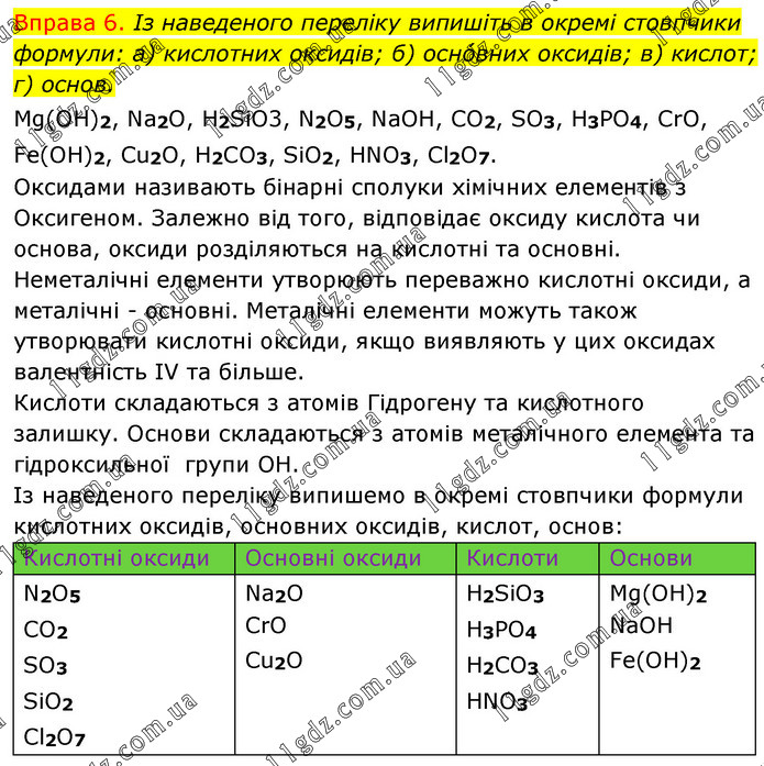 Вправа 6. Із наведеного переліку випишіть в окремі стовпчики формули: а) кислотних оксидів; б) оснóвних оксидів; в) кислот; г) основ. Mg(OH)2, Na2O, H2SiO3, N2O5, NaOH, CO2, SO3, H3PO4, CrО, Fe(OH)2, Cu2O, H2CO3, SiО2, HNO3, Cl2O7. Оксидами називають бінарні сполуки хімічних елементів з Оксигеном. Залежно від того, відповідає оксиду кислота чи основа, оксиди розділяються на кислотні та основні. Неметалічні елементи утворюють переважно кислотні оксиди, а металічні - основні. Металічні елементи можуть також утворювати кислотні оксиди, якщо виявляють у цих оксидах валентність IV та більше. Кислоти складаються з атомів Гідрогену та кислотного залишку. Основи складаються з атомів металічного елемента та гідроксильної групи ОН. Із наведеного переліку випишемо в окремі стовпчики формули кислотних оксидів, основних оксидів, кислот, основ: Кислотні оксиди Основні оксиди Кислоти Основи N2O5 CO2 SO3 SiO2 Cl2O7 Na2O CrO Cu2O H2SiO3 H3PO4 H2CO3 HNO3 Mg(OH)2 NaOH Fe(OH)2