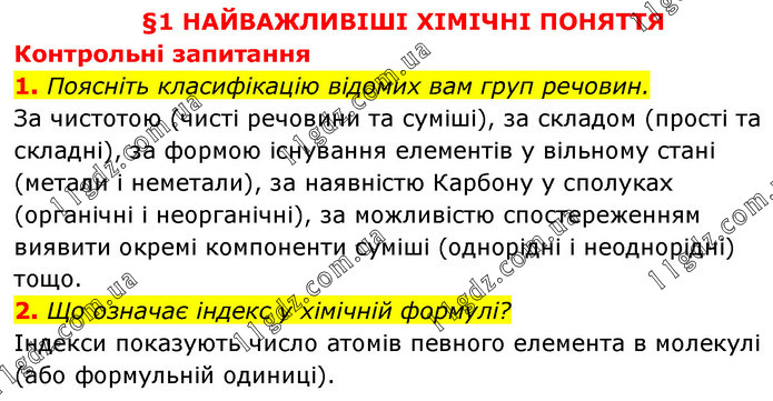 §1 НАЙВАЖЛИВІШІ ХІМІЧНІ ПОНЯТТЯ Контрольні запитання 1. Поясніть класифікацію відомих вам груп речовин. За чистотою (чисті речовини та суміші), за складом (прості та складні), за формою існування елементів у вільному стані (метали і неметали), за наявністю Карбону у сполуках (органічні і неорганічні), за можливістю спостереженням виявити окремі компоненти суміші (однорідні і неоднорідні) тощо. 2. Що означає індекс у хімічній формулі? Індекси показують число атомів певного елемента в молекулі (або формульній одиниці).