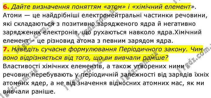 6. Дайте визначення поняттям «атом» і «хімічний елемент». Атоми — це найдрібніші електронейтральні частинки речовини, які складаються з позитивно зарядженого ядра й негативно заряджених електронів, що рухаються навколо ядра.Хімічний елемент – це різновид атома з певним зарядом ядра. 7. Наведіть сучасне формулювання Періодичного закону. Чим воно відрізняється від того, що ви вивчали раніше? Властивості хімічних елементів, а також утворених ними речовин перебувають у періодичній залежності від зарядів їхніх атомних ядер, а не від значення відносних атомних мас, як ми вивчали раніше.