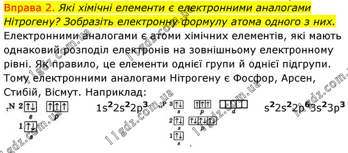 Вправа 2. Які хімічні елементи є електронними аналогами Нітрогену? Зобразіть електронну формулу атома одного з них. Електронними аналогами є атоми хімічних елементів, які мають однаковий розподіл електронів на зовнішньому електронному рівні. Як правило, це елементи однієї групи й однієї підгрупи. Тому електронними аналогами Нітрогену є Фосфор, Арсен, Стибій, Вісмут. Наприклад:
