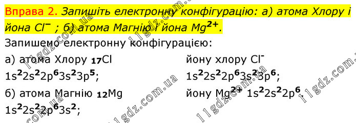 Вправа 2. Запишіть електронну конфігурацію: а) атома Хлору і йона Cl− ; б) атома Магнію і йона Mg2+. Запишемо електронну конфігурацією: а) атома Хлору 17Cl 1s22s22p63s23p5; б) атома Магнію 12Mg 1s22s22p63s2; йону хлору Cl- 1s22s22p63s23p6; йону Mg2+ 1s22s22p6.