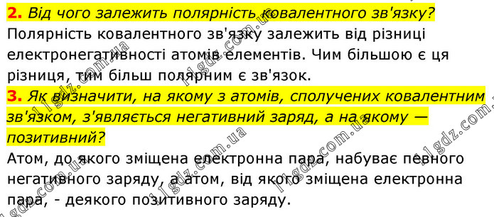 2. Від чого залежить полярність ковалентного зв'язку? Полярність ковалентного зв'язку залежить від різниці електронегативності атомів елементів. Чим більшою є ця різниця, тим більш полярним є зв'язок. 3. Як визначити, на якому з атомів, сполучених ковалентним зв'язком, з'являється негативний заряд, а на якому — позитивний? Атом, до якого зміщена електронна пара, набуває певного негативного заряду, а атом, від якого зміщена електронна пара, - деякого позитивного заряду.