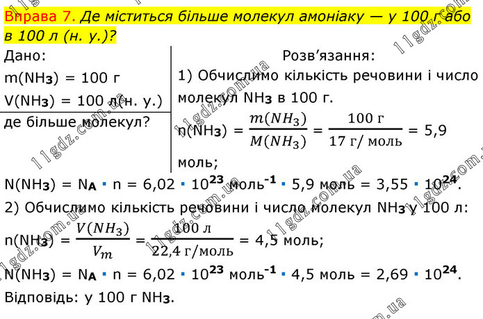 Вправа 7. Де міститься більше молекул амоніаку — у 100 г або в 100 л (н. у.)? Дано: m(NH3) = 100 г V(NH3) = 100 л(н. у.) Розв’язання: 1) Обчислимо кількість речовини і число молекул NH3 в 100 г. n(NH3) = (m(NH_3))/(M(NH_3)) = (100 г)/(17 г/ моль) = 5,9 моль; де більше молекул? N(NH3) = NA ∙ n = 6,02 ∙ 1023 моль-1 ∙ 5,9 моль = 3,55 ∙ 1024. 2) Обчислимо кількість речовини і число молекул NH3 у 100 л: n(NH3) = (V(NH_3))/V_m = (100 л)/(22,4 г/моль) = 4,5 моль; N(NH3) = NA ∙ n = 6,02 ∙ 1023 моль-1 ∙ 4,5 моль = 2,69 ∙ 1024. Відповідь: у 100 г NH3.