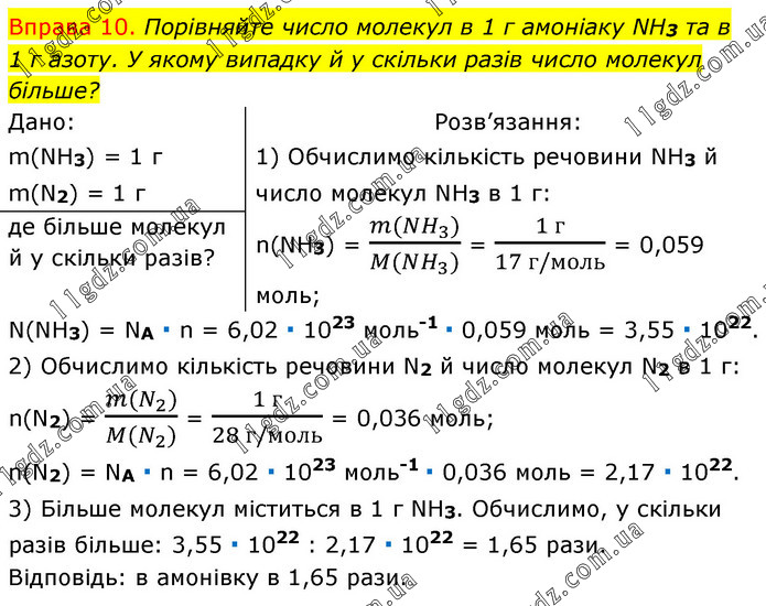 Вправа 10. Порівняйте число молекул в 1 г амоніаку NH3 та в 1 г азоту. У якому випадку й у скільки разів число молекул більше? Дано: m(NH3) = 1 г m(N2) = 1 г Розв’язання: 1) Обчислимо кількість речовини NH3 й число молекул NH3 в 1 г: n(NH3) = (m(NH_3))/(M(NH_3)) = (1 г)/(17 г/моль) = 0,059 моль; де більше молекул й у скільки разів? N(NH3) = NA ∙ n = 6,02 ∙ 1023 моль-1 ∙ 0,059 моль = 3,55 ∙ 1022. 2) Обчислимо кількість речовини N2 й число молекул N2 в 1 г: n(N2) = (m(N_2))/(M(N_2)) = (1 г)/(28 г/моль) = 0,036 моль; n(N2) = NA ∙ n = 6,02 ∙ 1023 моль-1 ∙ 0,036 моль = 2,17 ∙ 1022. 3) Більше молекул міститься в 1 г NH3. Обчислимо, у скільки разів більше: 3,55 ∙ 1022 : 2,17 ∙ 1022 = 1,65 рази. Відповідь: в амонівку в 1,65 рази.