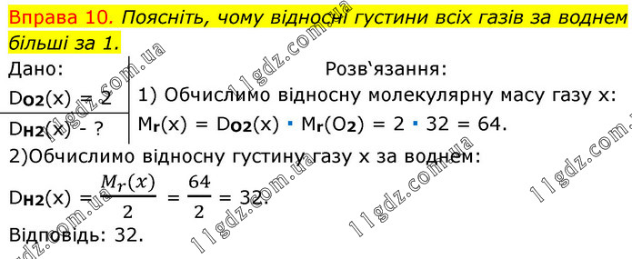 Вправа 10. Поясніть, чому відносні густини всіх газів за воднем більші за 1. Дано: DO2(x) = 2 Розв‘язання: 1) Обчислимо відносну молекулярну масу газу х: Mr(x) = DO2(x) ∙ Mr(O2) = 2 ∙ 32 = 64. DH2(x) - ? 2)Обчислимо відносну густину газу х за воднем: DH2(x) = (M_r (x))/2 = 64/2 = 32. Відповідь: 32.