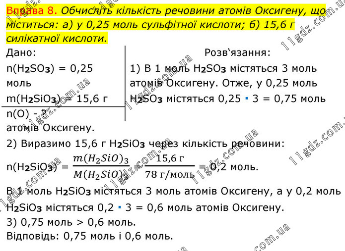 Вправа 8. Обчисліть кількість речовини атомів Оксигену, що міститься: а) у 0,25 моль сульфітної кислоти; б) 15,6 г силікатної кислоти. Дано: n(H2SO3) = 0,25 моль m(H2SiO3) = 15,6 г Розв‘язання: 1) В 1 моль H2SO3 містяться 3 моль атомів Оксигену. Отже, у 0,25 моль H2SO3 містяться 0,25 ∙ 3 = 0,75 моль n(O) - ? атомів Оксигену. 2) Виразимо 15,6 г H2SiO3 через кількість речовини: n(H2SiO3) = (m(H_2 Si〖O)〗_3)/(M(H_2 Si〖O)〗_3 ) = (15,6 г)/(78 г/моль) = 0,2 моль. В 1 моль H2SiO3 містяться 3 моль атомів Оксигену, а у 0,2 моль H2SiO3 містяться 0,2 ∙ 3 = 0,6 моль атомів Оксигену. 3) 0,75 моль > 0,6 моль. Відповідь: 0,75 моль і 0,6 моль.