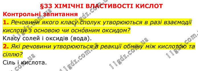 §33 ХІМІЧНІ ВЛАСТИВОСТІ КИСЛОТ Контрольні запитання 1. Речовини якого класу сполук утворюються в разі взаємодії кислоти з основою чи оснóвним оксидом? Класу солей і оксидів (вода). 2. Які речовини утворюються в реакції обміну між кислотою та сіллю? Сіль і кислота.