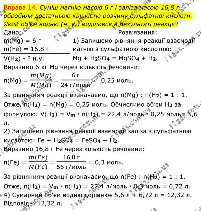 Вправа 14. Суміш магнію масою 6 г і заліза масою 16,8 г обробили достатньою кількістю розчину сульфатної кислоти. Який об’єм водню (н. у.) виділився в результаті реакції? Дано: m(Mg) = 6 г m(Fe) = 16,8 г Розв’язання: 1) Запишемо рівняння реакції взаємодії магнію з сульфатною кислотою: Mg + H2SO4 = MgSO4 + H2. V(H2) - ? н.у. Виразимо 6 кг Mg через кількість речовини: n(Mg) = (m(Mg))/(M(Mg)) = (6 г)/(24 г/моль) = 0,25 моль. За рівнянням реакції визначаємо, що n(Mg) : n(H2) = 1 : 1. Отже, n(H2) = n(Mg) = 0,25 моль. Обчислимо об’єм H2 за формулою: V(H2) = Vm ∙ n(H2) = 22,4 л/моль ∙ 0,25 моль= 5,6 л. 2) Запишемо рівняння реакції взаємодії заліза з сульфатною кислотою: Fe + H2SO4 = FeSO4 + H2. Виразимо 16,8 г Fe через кількість речовини: n(Fe) = (m(Fe))/(M(Fe)) = (16,8 г)/(56 г/моль) = 0,3 моль. За рівнянням реакції визначаємо, що n(Fe) : n(H2) = 1 : 1. Отже, n(H2) = Vm ∙ n(H2) = 22,4 л/моль ∙ 0,3 моль = 6,72 л. 4) Сумарний об’єм водню дорівнює 5,6 л + 6,72 л = 12,32 л. Відповідь: 12,32 л.