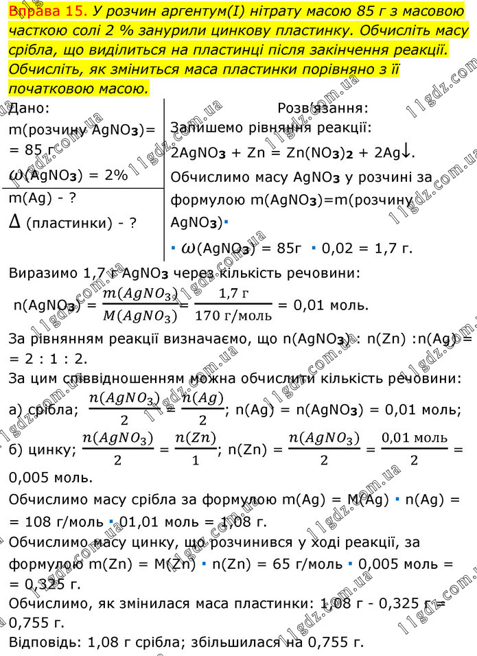 Вправа 15. У розчин аргентум(І) нітрату масою 85 г з масовою часткою солі 2 % занурили цинкову пластинку. Обчисліть масу срібла, що виділиться на пластинці після закінчення реакції. Обчисліть, як зміниться маса пластинки порівняно з її початковою масою. Дано: m(розчину AgNO3)= = 85 г ω(AgNO3) = 2% Розв’язання: Запишемо рівняння реакції: 2AgNO3 + Zn = Zn(NO3)2 + 2Ag↓. Обчислимо масу AgNO3 у розчині за формулою m(AgNO3)=m(розчину AgNO3)∙ ∙ ω(AgNO3) = 85г ∙ 0,02 = 1,7 г. m(Ag) - ? ∆ (пластинки) - ? Виразимо 1,7 г AgNO3 через кількість речовини: n(AgNO3) = (m(AgNO_3))/(M(AgNO_3))= (1,7 г)/(170 г/моль) = 0,01 моль. За рівнянням реакції визначаємо, що n(AgNO3) : n(Zn) :n(Ag) = = 2 : 1 : 2. За цим співвідношенням можна обчислити кількість речовини: a) срібла; (n(AgNO_3))/2 = (n(Ag))/2; n(Ag) = n(AgNO3) = 0,01 моль; б) цинку; (n(AgNO_3))/2 = (n(Zn))/1; n(Zn) = (n(AgNO_3))/2 = (0,01 моль)/2 = 0,005 моль. Обчислимо масу срібла за формулою m(Ag) = M(Ag) ∙ n(Ag) = = 108 г/моль ∙ 01,01 моль = 1,08 г. Обчислимо масу цинку, що розчинився у ході реакції, за формулою m(Zn) = M(Zn) ∙ n(Zn) = 65 г/моль ∙ 0,005 моль = = 0,325 г. Обчислимо, як змінилася маса пластинки: 1,08 г - 0,325 г = 0,755 г. Відповідь: 1,08 г срібла; збільшилася на 0,755 г.