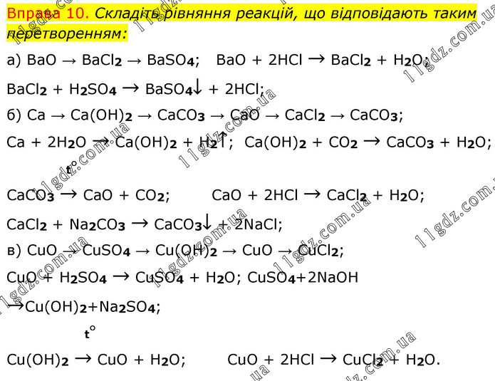 Вправа 10. Складіть рівняння реакцій, що відповідають таким перетворенням: а) BaO → BaCl2 → BaSO4; BaO + 2HCl → BaCl2 + H2O; BaCl2 + H2SO4 → BaSO4↓ + 2HCl; б) Ca → Ca(OH)2 → CaCO3 → CaO → CaCl2 → CaCO3; Ca + 2H2O → Ca(OH)2 + H2↑; Ca(OH)2 + CO2 → CaCO3 + H2O; t° CaCO3 → CaO + CO2; CaO + 2HCl → CaCl2 + H2O; CaCl2 + Na2CO3 → CaCO3↓ + 2NaCl; в) CuO → CuSO4 → Cu(OH)2 → CuO → CuCl2; CuO + H2SO4 → CuSO4 + H2O; CuSO4+2NaOH →Cu(OH)2+Na2SO4; t° Cu(OH)2 → CuO + H2O; CuO + 2HCl → CuCl2 + H2O.